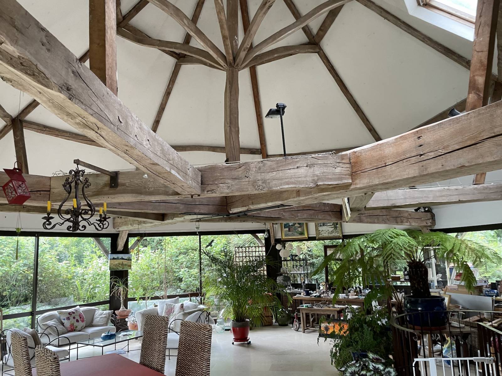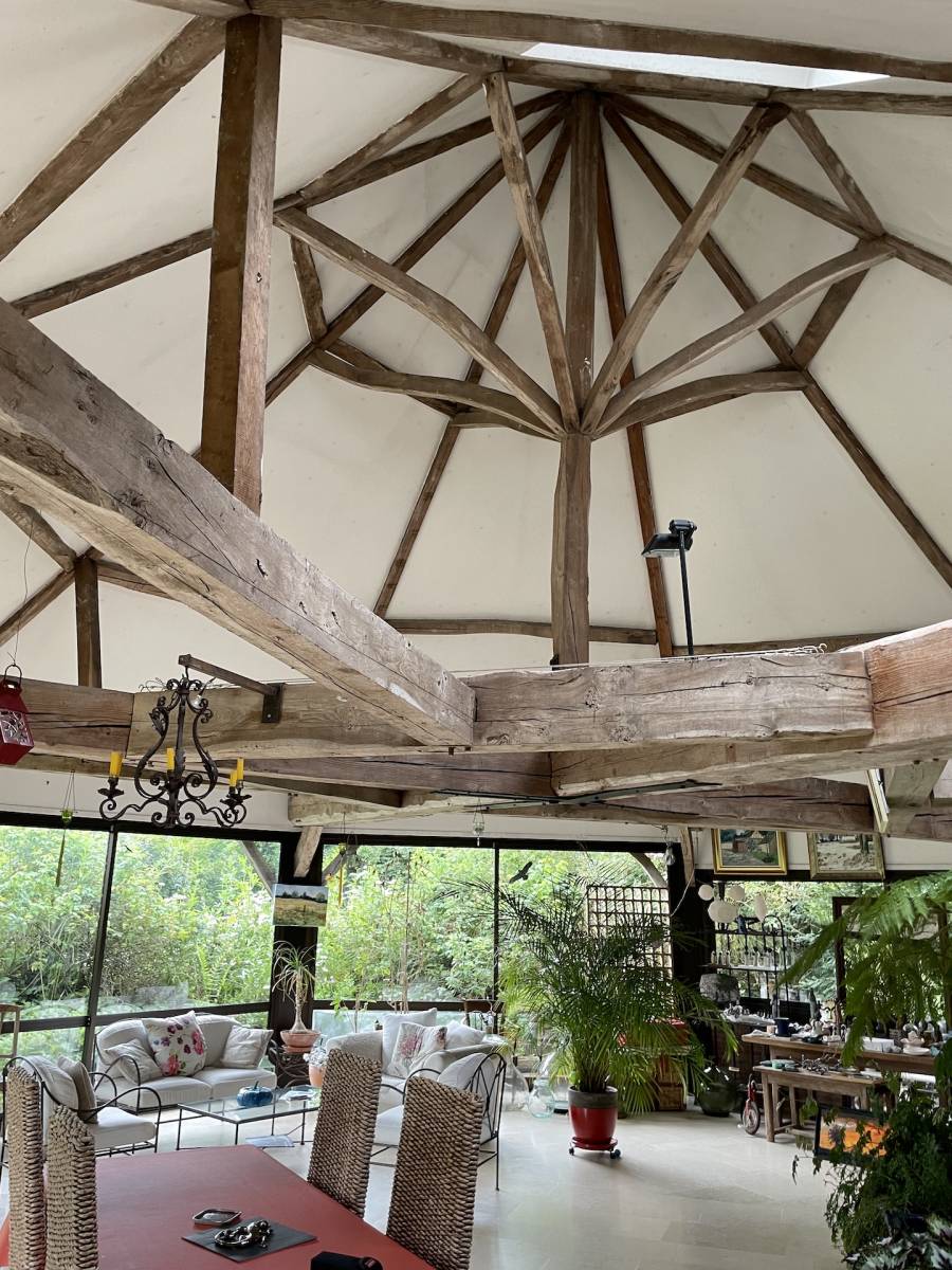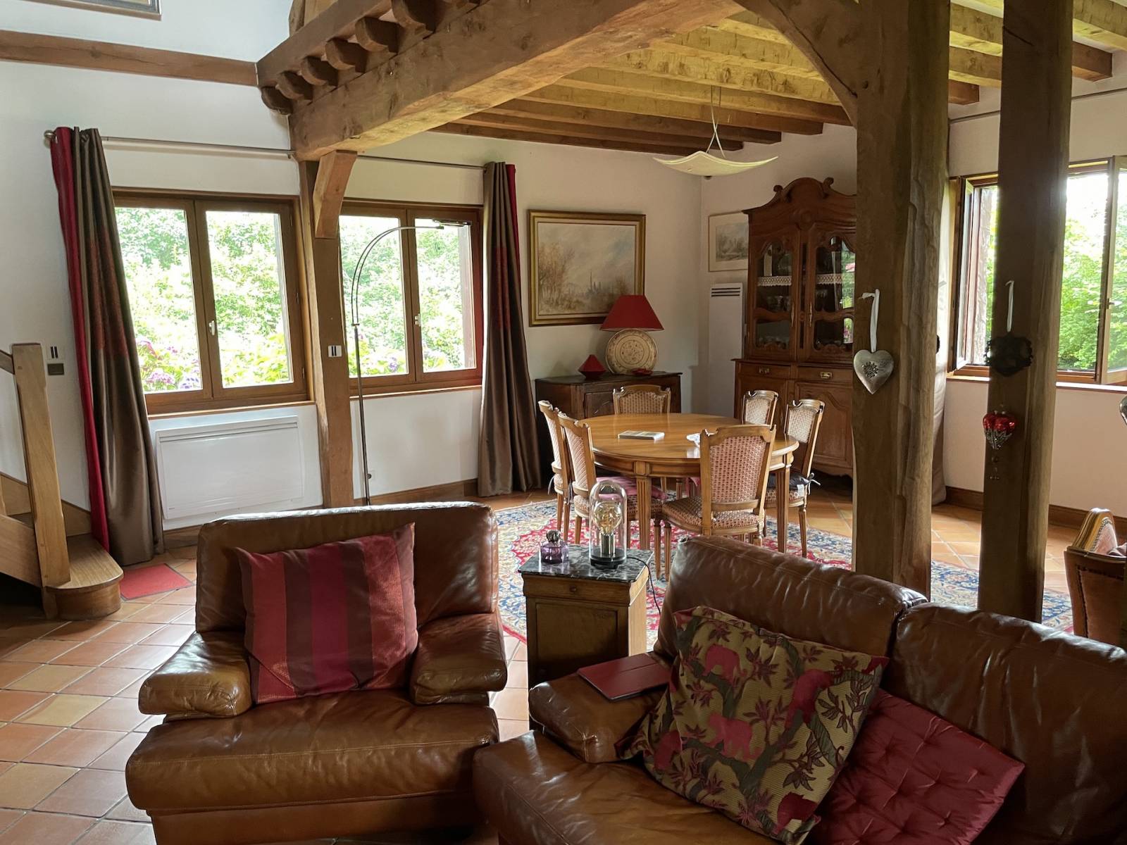 - au rez-de-chaussée un vaste séjour de 80 m2 aménagé dans un ancien manège attenant avec charpente remarquable et nombreuses baies vitrées, une salle à manger-séjour cathédrale avec cheminée de 55 m2, une cuisine aménagée et équipée de 16 m2, salle de douche de 5 m2, wc séparés, dégagement, chambre de 19 m2 et entrée de 8 m2. Hauteur sous plafonds de 3 mètres.