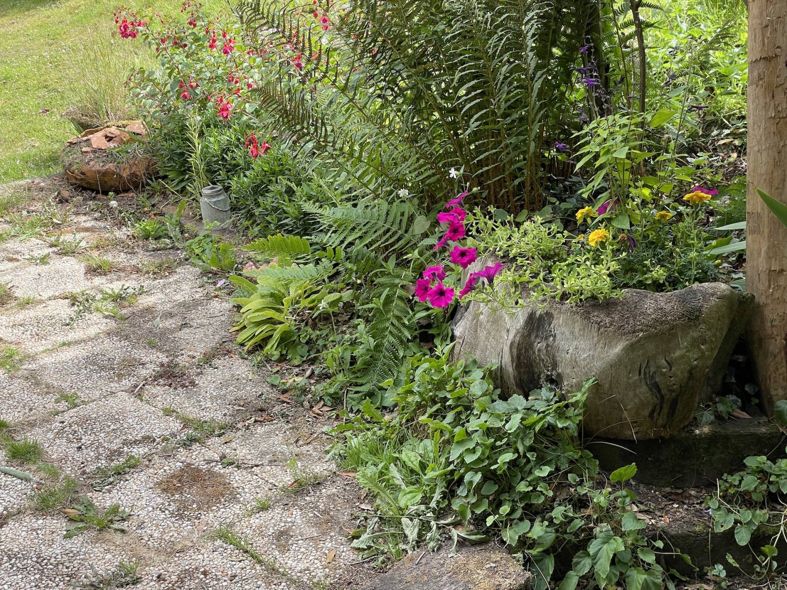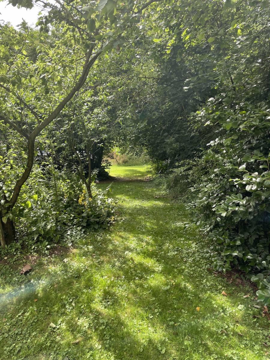 Terrain en nature de jardin paysager avec nombreux arbres et arbustes matures.