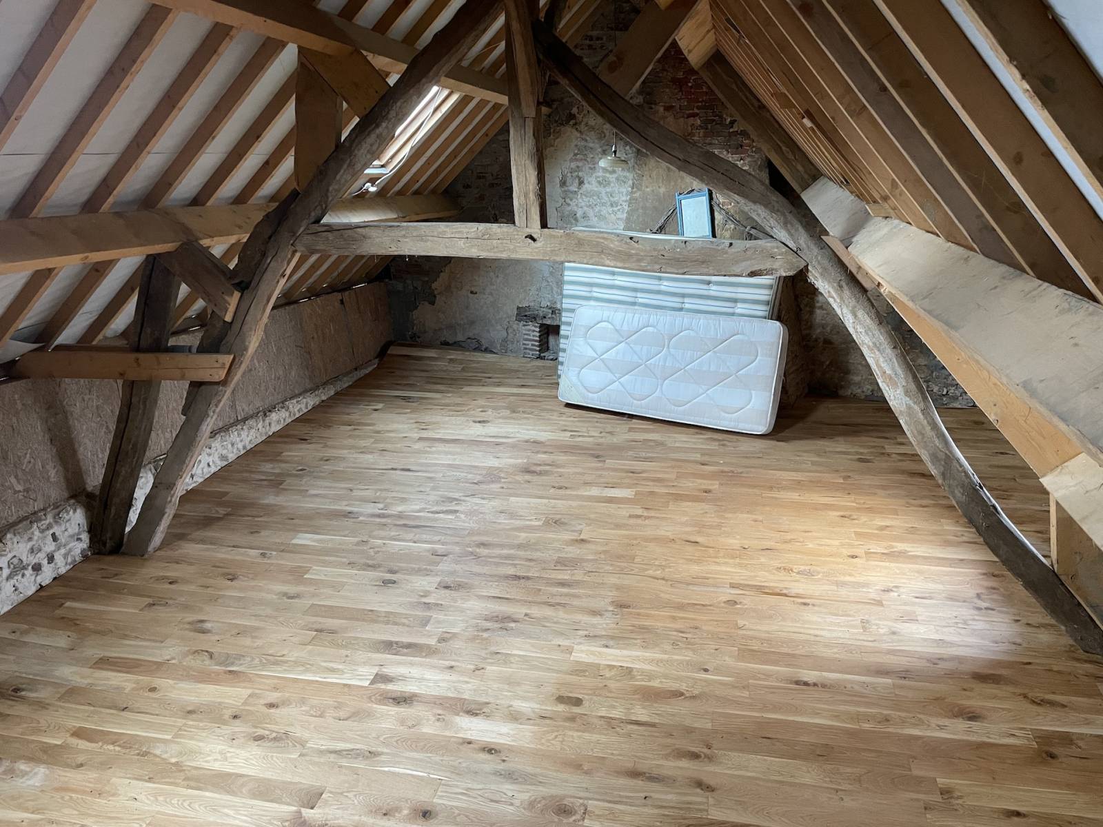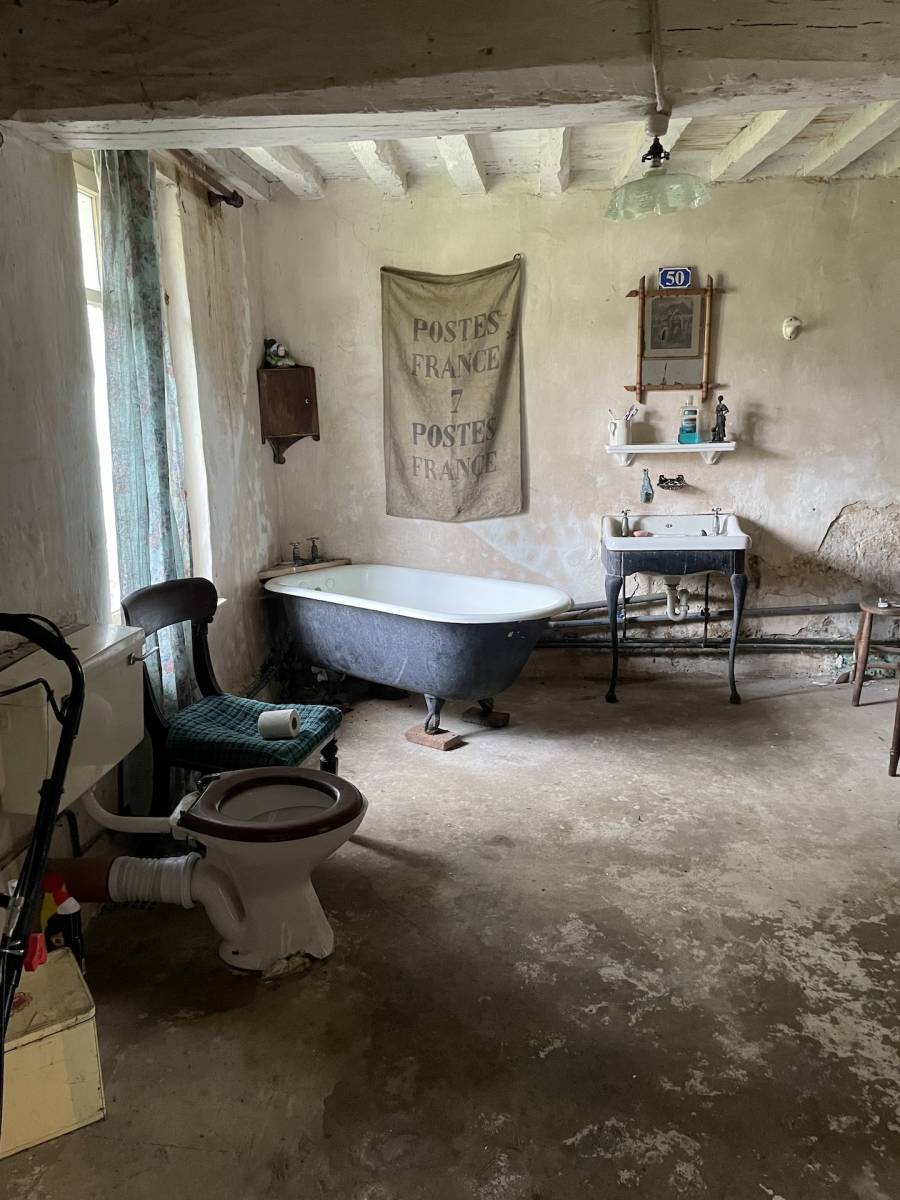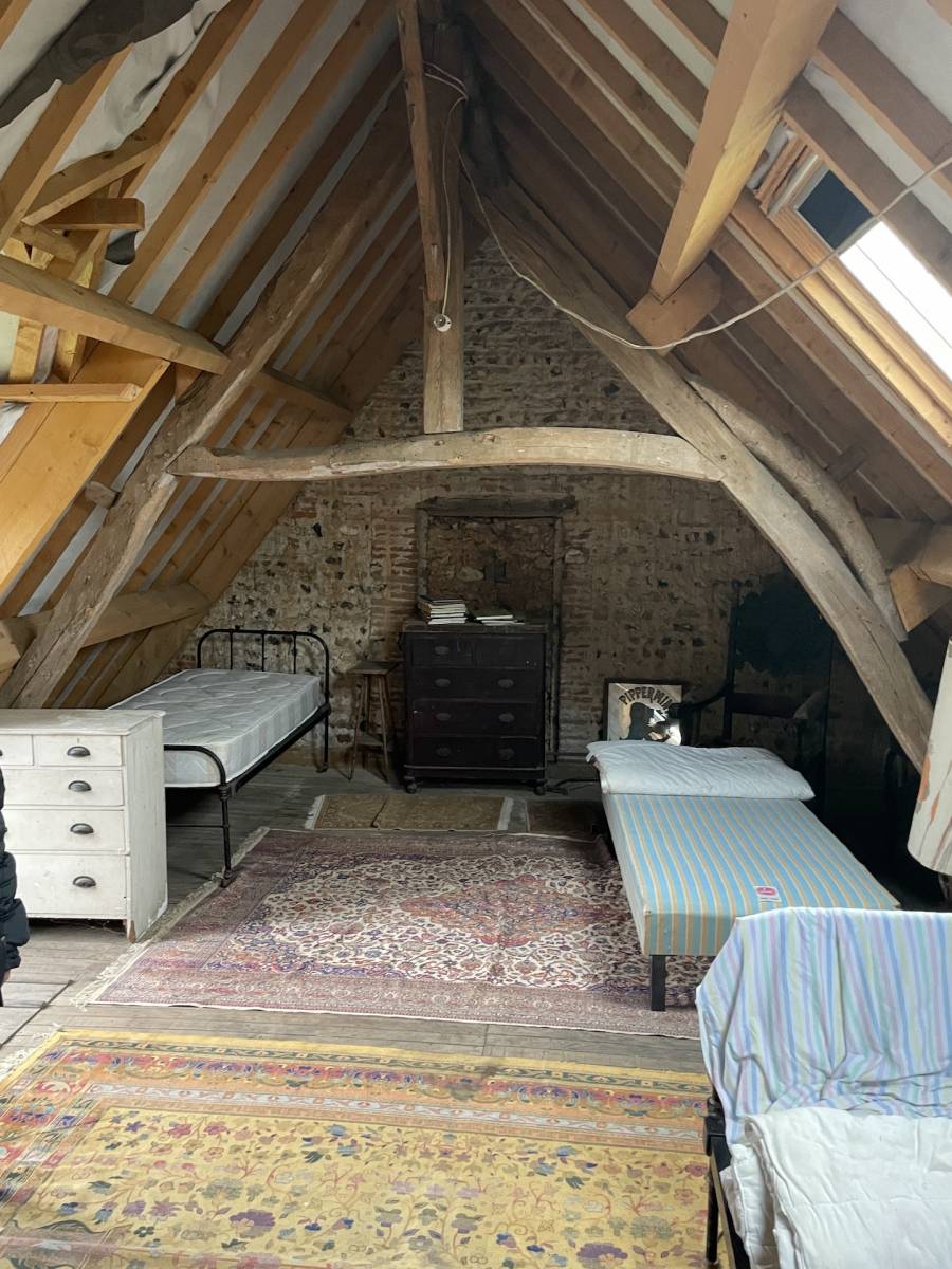 This Normandy half-timbered and Saint Jean bricks house offers plenty of potential, awaiting complete restoration, yet its slate roof was redone in 2013. With a total potential living space of nearly 200 m2, it comprises 7 main rooms including a spacious 50 m2 living room, a 7 m2 entrance hall, a 20 m2 dining room kitchen with fireplace, a 20 m2 lounge with fireplace, a 14 m2 bathroom with toilet, and a 9 m2 pantry. Upstairs, there are 2 "dormitory" spaces of 34 and 38 m2 respectively. No heating installed, connected to main drainage. Lovely garden terrain of 414 m2.