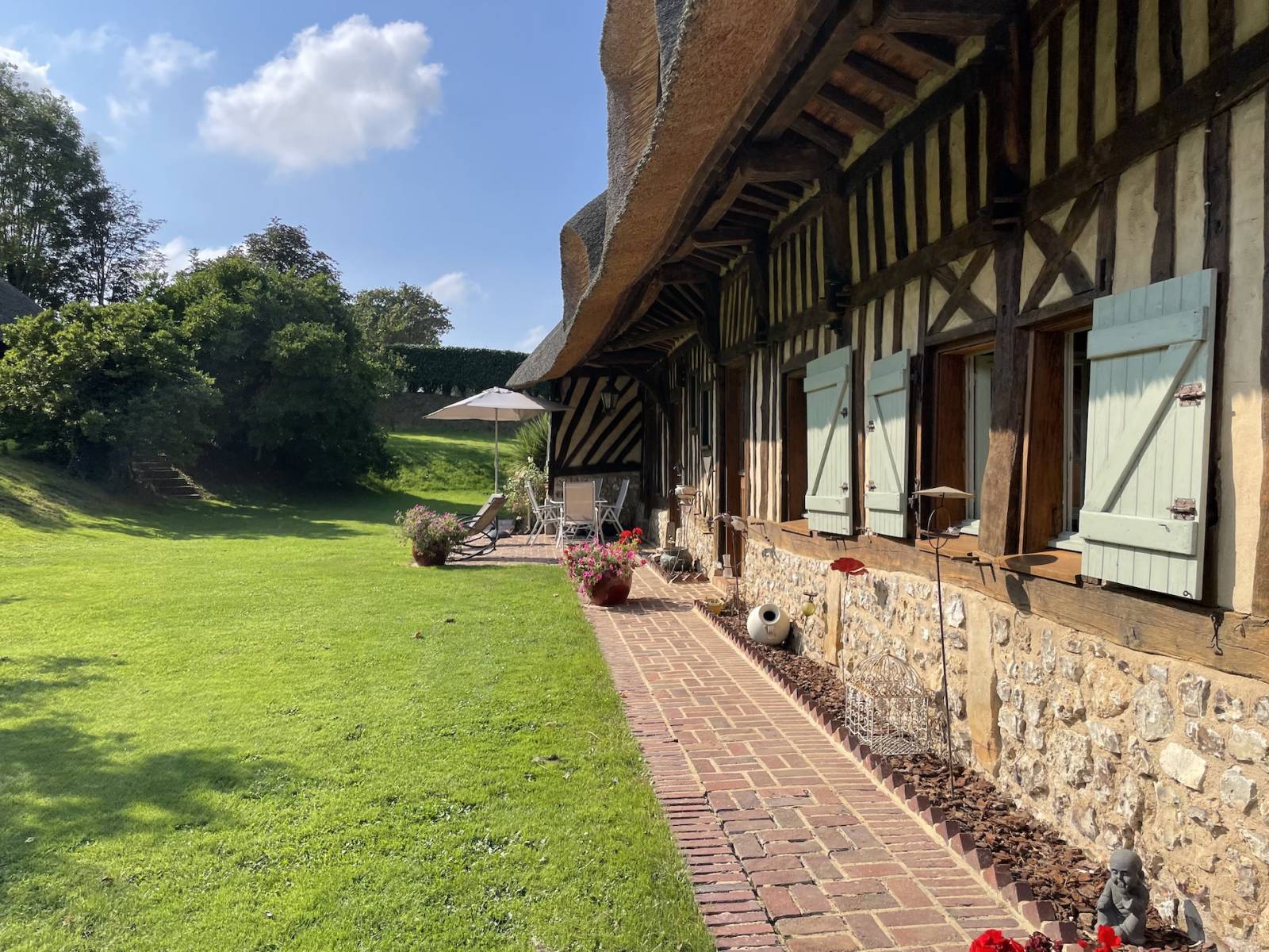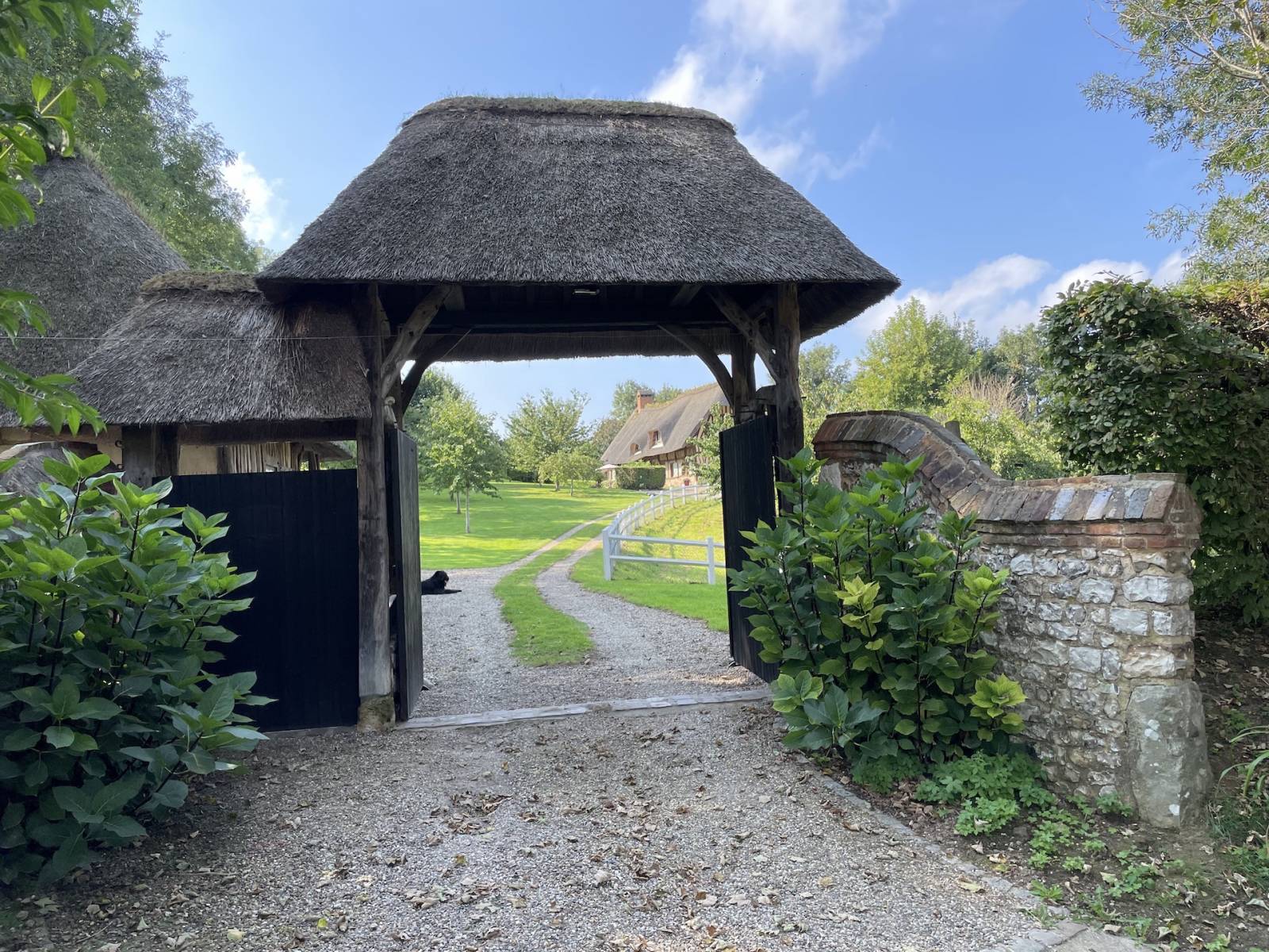 EXCLUSIVITÉ ÉLÉGANTE ET AUTHENTIQUE CHAUMIÈRE AUX PORTES D'ÉTRETAT : A seulement 3 kilomètres du village emblématique d'ÉTRETAT, dans un environnement rare et préservé, cet ensemble normand de caractère comprend une exceptionnelle chaumière normande de 7 pièces principales. D'environ 218 m2, elle comprend un vaste séjour cathédrale de 65 m2 avec cheminée et sols en pierres, une cuisine aménagée et équipée de 17 m2, 2 chambres de plain-pied (12 et 15 m2), une salle de douche de 9 m2 de plain-pied également, wc séparés et pièce de service-lingerie de 23 m2. A l'étage : une mezzanine palière de 11 m2, 2 chambres (16 et 25 m2), une chambrette, salle d'eau et wc séparés. Beaux matériaux authentiques. Très large, avec de belles hauteurs sous plafonds, elle bénéficie de nombreuses vues dégagées sur la campagne. Manège normand de 70 m2 avec cave de 12 m2 dessous. Ensemble portail-dépendance de 40 m2. Jardin clos d'environ 6.000 m2 avec talus plantés de frênes et nombreux arbres fruitiers. Enormément de charme et de "chien" pour cet ensemble qui jouit d'un environnement rare, calme, sans voisinage immédiat et tout cela à 5 minutes d'ÉTRETAT, accessible à pied ou à vélo. Énorme potentiel touristique.