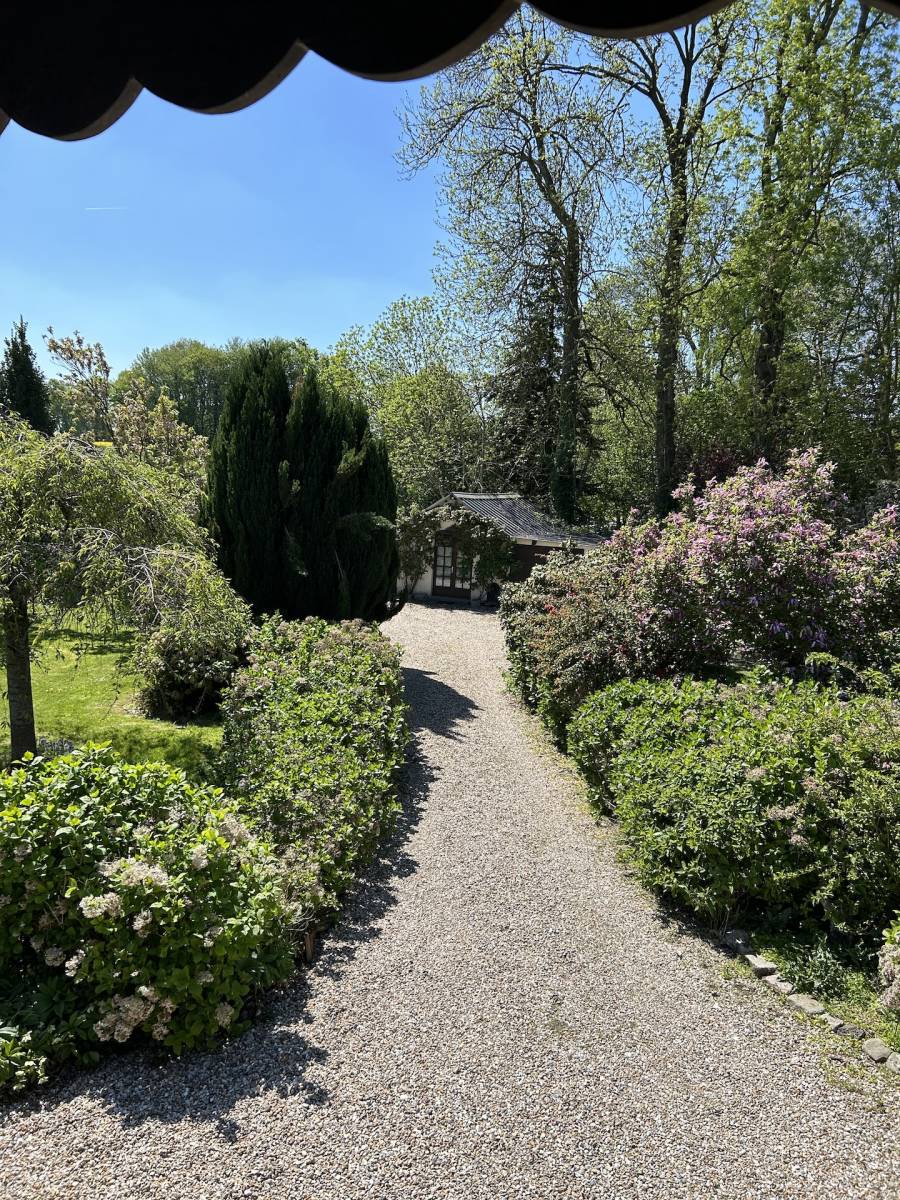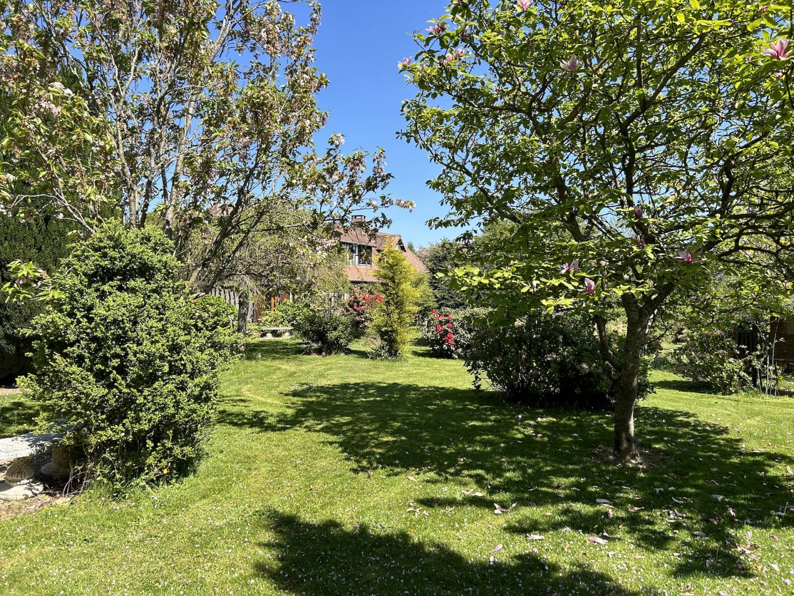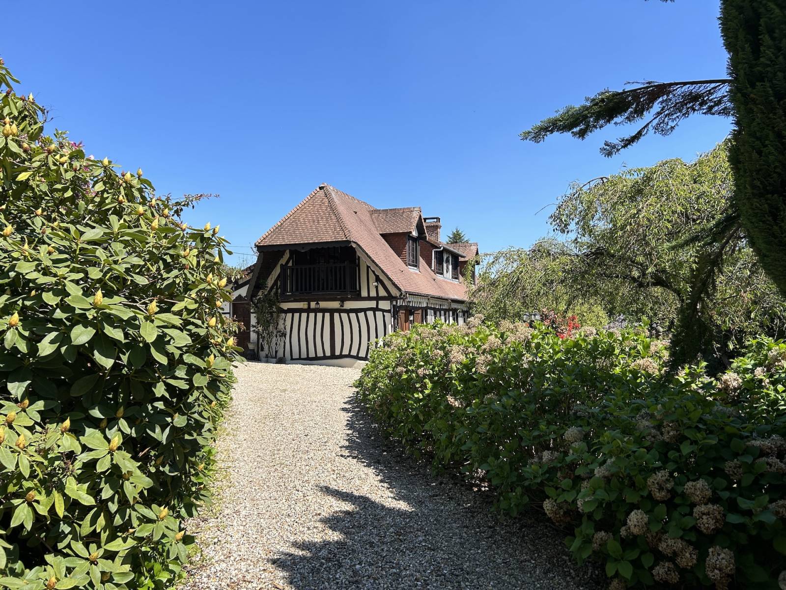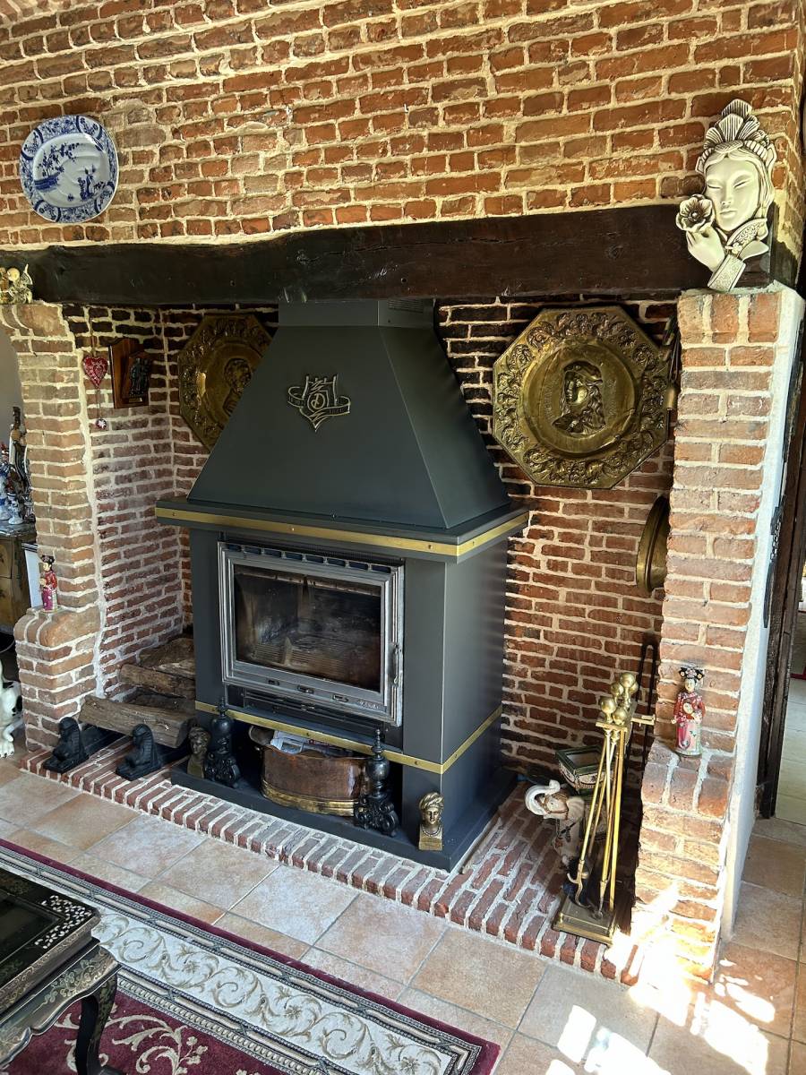 Norman timber-framed longère with charming English-style garden : This 6 rooms property of approximately 140 m² comprises on the ground floor : an entrance hall of 5 m², a fitted and equipped kitchen of 13 m², a bathroom with shower of 7 m², a dining room of 20 m², a living room with fireplace of 18 m², a ground-floor bedroom of 17 m², a separate WC, a utility and boiler room of 4 m², and a conservatory-style lounge of 8 m². Upstairs, there is a landing study room of 10 m² and two bedrooms (23 and 14 m²), one of which includes a dressing room and WC. The bedrooms offer picturesque views over the Norman countryside. The property also includes an 18 m² workshop and two attached garages of 16 and 18 m², as well as a 38 m² wood shelter. Heating is provided by an oil boiler and sanitation is individual. The carefully designed and mature garden was landscaped in the English style by the previous owners. The house is located in a peaceful setting just 5 minutes from shops and around 20 kilometers from the beaches of Les Petites Dalles and Veulettes-sur-Mer. A great opportunity to acquire a characterful longère with a remarkable garden in a pleasant rural environment.