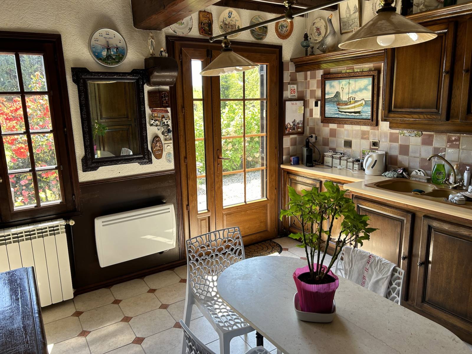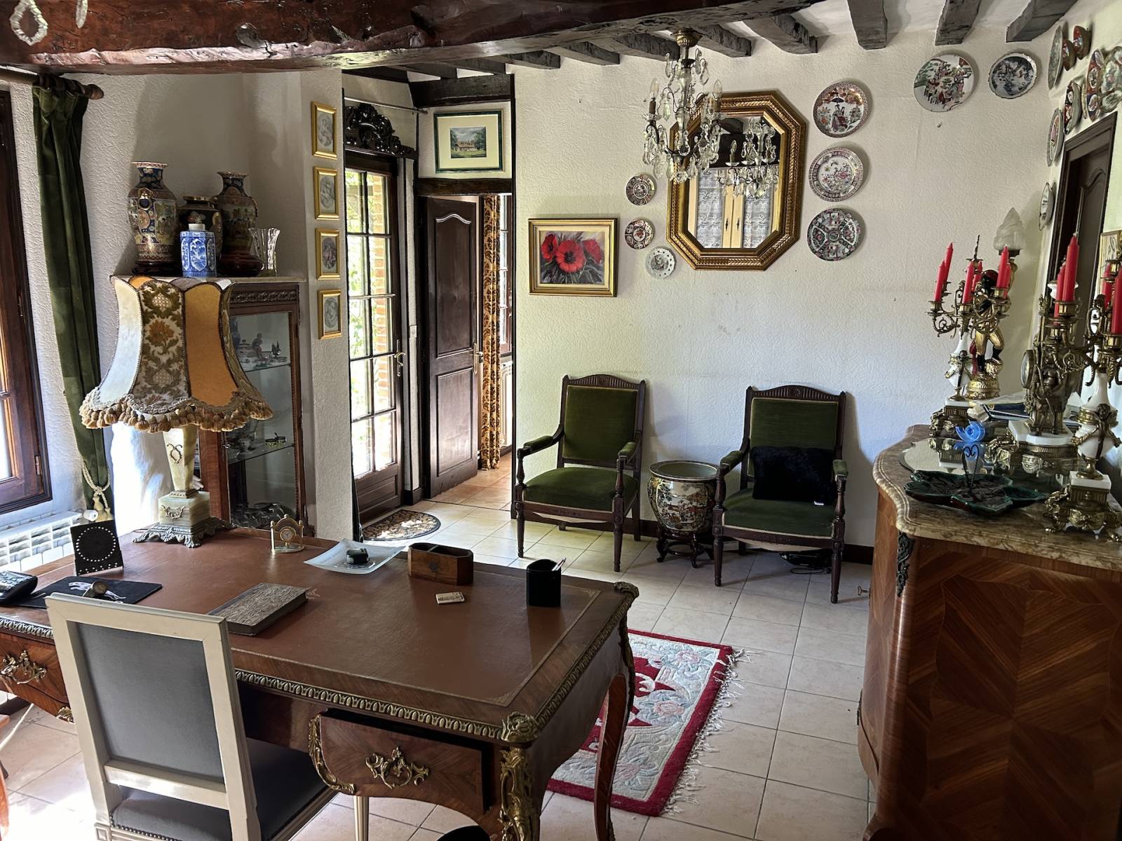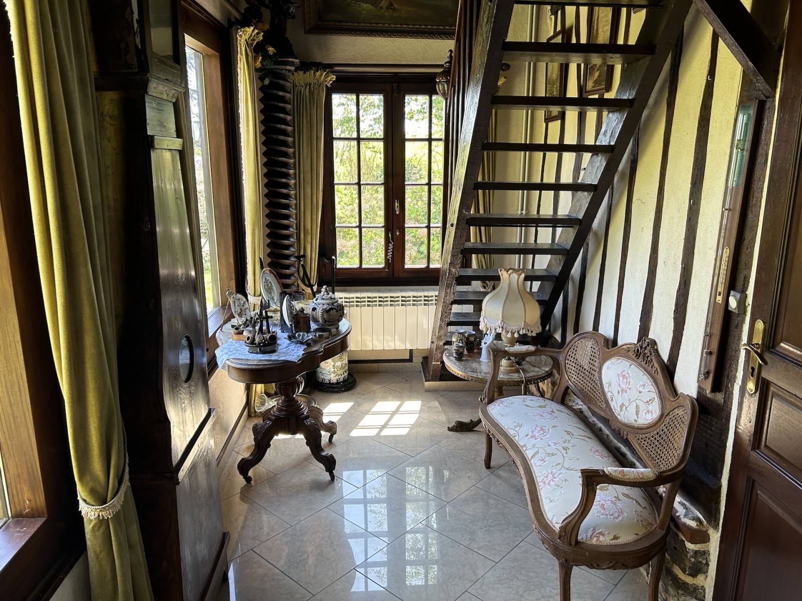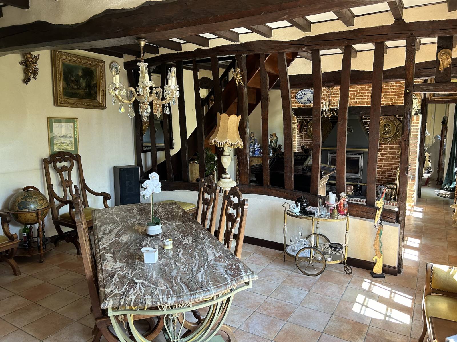Norman timber-framed longère with charming English-style garden : This 6 rooms property of approximately 140 m² comprises on the ground floor : an entrance hall of 5 m², a fitted and equipped kitchen of 13 m², a bathroom with shower of 7 m², a dining room of 20 m², a living room with fireplace of 18 m², a ground-floor bedroom of 17 m², a separate WC, a utility and boiler room of 4 m², and a conservatory-style lounge of 8 m². Upstairs, there is a landing study room of 10 m² and two bedrooms (23 and 14 m²), one of which includes a dressing room and WC. The bedrooms offer picturesque views over the Norman countryside. The property also includes an 18 m² workshop and two attached garages of 16 and 18 m², as well as a 38 m² wood shelter. Heating is provided by an oil boiler and sanitation is individual. The carefully designed and mature garden was landscaped in the English style by the previous owners. The house is located in a peaceful setting just 5 minutes from shops and around 20 kilometers from the beaches of Les Petites Dalles and Veulettes-sur-Mer. A great opportunity to acquire a characterful longère with a remarkable garden in a pleasant rural environment.